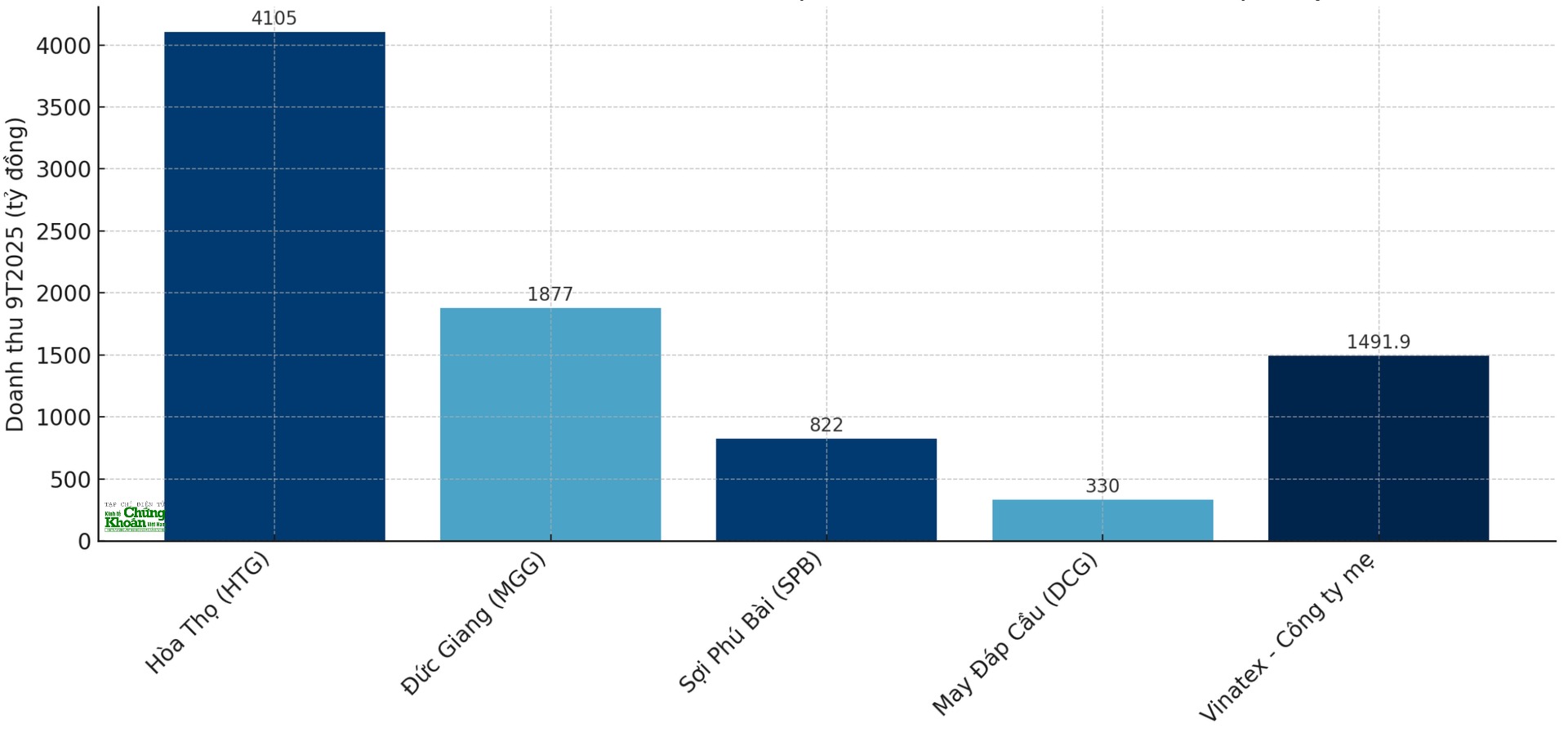 Đức Giang<#b> (MGG) đạt hơn 1.877 tỷ đồng doanh thu trong 9 tháng và 22,1 tỷ đồng lợi nhuận trước thuế, hoàn thành hơn 70% kế hoạch năm. May Đáp Cầu<#b> (DCG) đạt 330 tỷ đồng doanh thu và 15,6 tỷ đồng lãi trước thuế, hoàn thành gần 80% mục tiêu lợi nhuận. Sợi Phú Bài (SPB) đạt 822 tỷ đồng doanh thu nhưng lợi nhuận lại tăng gần 72% lên 17 tỷ đồng. <#b>Việt Thắng (TVT) duy trì tăng trưởng với 6 tỷ đồng lợi nhuận chỉ riêng tháng 8, vượt 8% chỉ tiêu lợi nhuận năm sau 9 tháng.<#p>