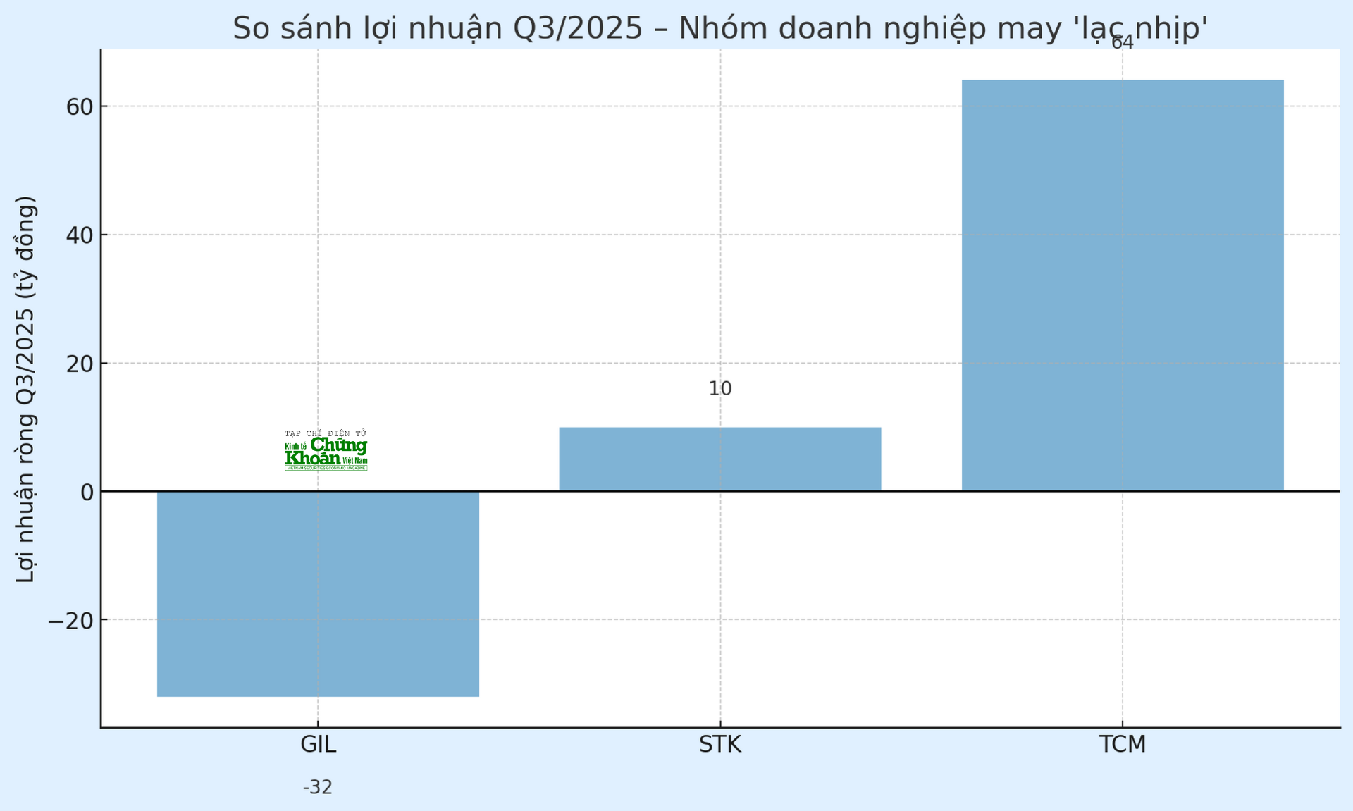 Công ty CP Sản xuất kinh doanh và Xuất nhập khẩu Bình Thạnh<#b> (Gilimex; HOSE: GIL) là trường hợp điển hình nhất. Sau khoản lỗ 71 tỷ đồng trong quý 2, doanh nghiệp tiếp tục lỗ 32 tỷ đồng trong quý 3, kéo tổng lỗ 9 tháng vượt 100 tỷ đồng, mức sâu nhất trong lịch sử. Doanh thu quý 3 đạt 198 tỷ đồng, tăng 30%, nhưng giá vốn tăng gần gấp rưỡi khiến biên lãi gộp giảm còn 8,6%. Dòng tiền kinh doanh âm hơn 481 tỷ đồng, tồn kho phình lên 1.881 tỷ đồng, còn nợ vay vượt 925 tỷ đồng. Tranh chấp kéo dài với Amazon và khoản đầu tư vào Garmex Sài Gòn đang tạm lỗ tới 84% khiến triển vọng doanh nghiệp trở nên khó khăn hơn.<#p>