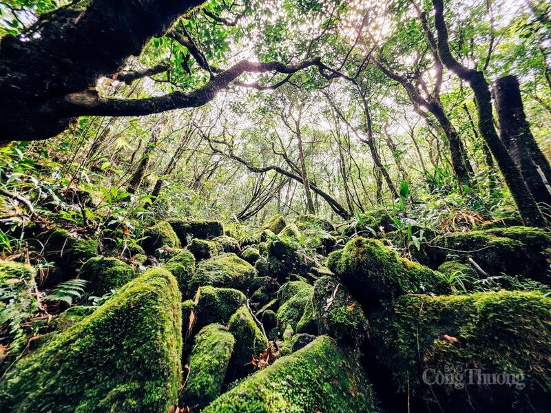 Đá phủ rêu xanh nằm dọc đường đi lên đỉnh Pa Thiên.