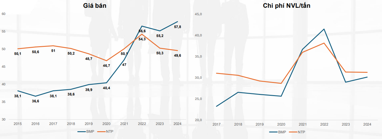 Trong khi đó, sản lượng lại diễn biến theo hướng ngược lại, BMP giảm liên tục từ 2020 đến 2024, xuống mức hơn 77.000 tấn; hiệu suất sử dụng công suất thấp hơn đáng kể so với trước. NTP giữ được sự ổn định quanh mức 100.000–108.000 tấn mỗi năm, giúp doanh nghiệp tận dụng tốt hơn chi phí cố định và duy trì vị thế tại miền Bắc.