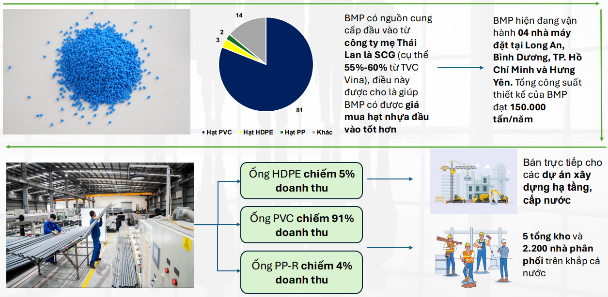 Trong khi đó, BMP tập trung gần như tuyệt đối vào PVC. Điều này giúp NTP linh hoạt hơn trước sự thay đổi của nhu cầu, nhất là khi đầu tư công tăng tốc và các khu công nghiệp mở rộng trong giai đoạn 2024–2025.