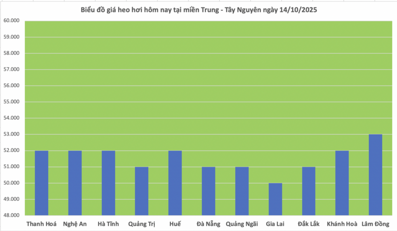 Trong đó, Gia Lai tiếp tục là địa phương có giá thấp nhất khu vực với 50.000 đồng/kg, còn Lâm Đồng duy trì mức cao nhất là 53.000 đồng/kg.