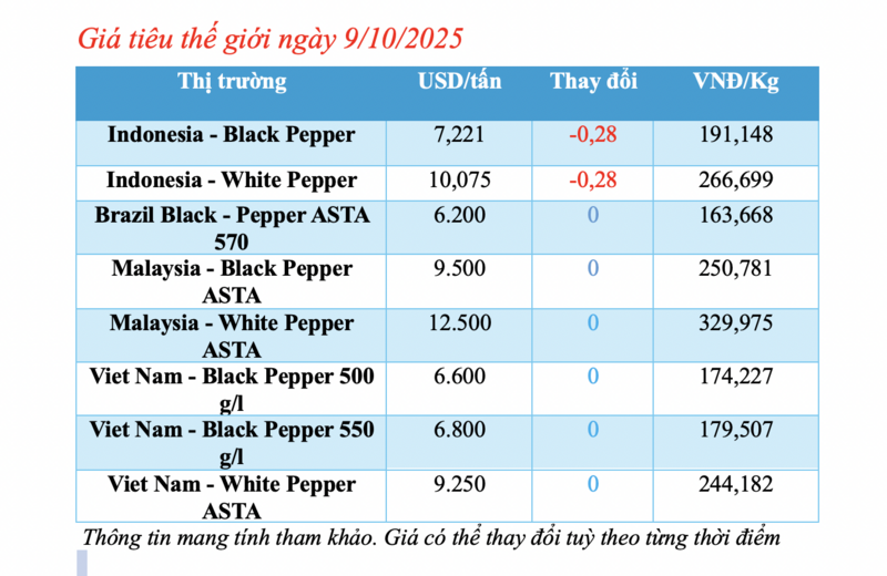 Cập nhật giá tiêu thế giới từ Hiệp hội Hồ tiêu Quốc tế (IPC) lúc 4 giờ 30 phút sáng 9/10/2025, thị trường hồ tiêu xuất khẩu hôm nay tiếp tục ghi nhận sự biến động nhẹ tại thị trường Indonesia.