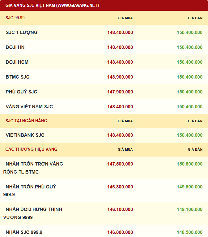 Giá vàng miếng được Công ty TNHH MTV Vàng bạc đá quý Sài Gòn - SJC, Bảo Tín Minh Châu, PNJ và Tập đoàn DOJI cùng niêm yết giá vàng ở mức 148,4 - 150,4 triệu đồng/lượng (mua vào - bán ra), mức giá không thay đổi ở cả hai chiều mua - bán so với hôm qua.