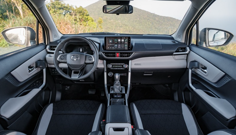 Bên trong cabin, Toyota bố trí không gian rộng rãi với hàng ghế 2 có thể trượt, ngả và gập linh hoạt theo nhu cầu. Hàng ghế 3 thoải mái hơn nhiều mẫu MPV cùng phân khúc. Hệ thống giải trí gồm màn hình cảm ứng trung tâm hiện đại, hỗ trợ kết nối Apple CarPlay/Android Auto.