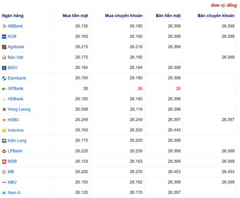 Ngân hàng GPBank đang mua chuyển khoản USD với giá thấp nhất là: 1 USD = 26 VND
